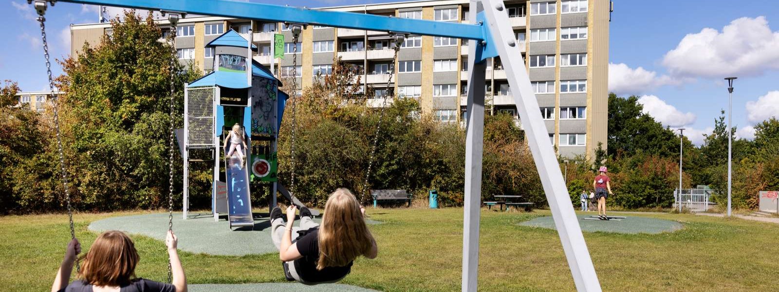 På legepladsen er der et legetårn med rutsjebaner. Derudover både gynger og trampoliner. Legepladsen ligger ved siden af Tårnby Skatepark.