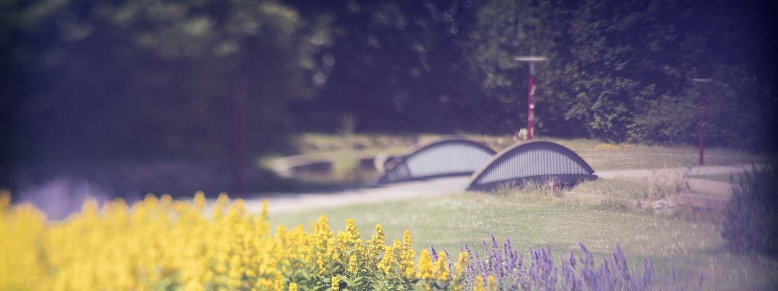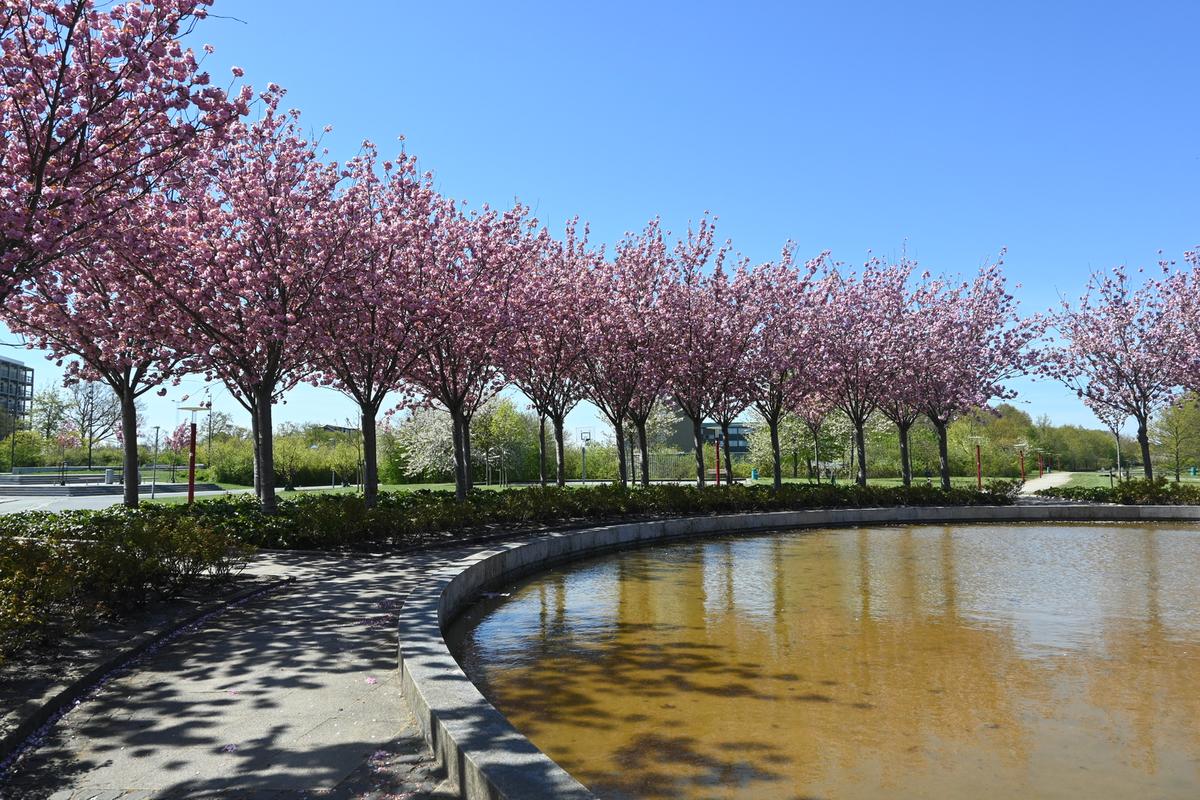 Gennem hele Byparken løber en kanal med rislende vand, vandplanter og andehuse.